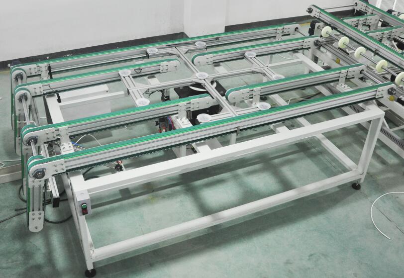 自動完成電池板旋轉90°,改變傳送方式。此段可根據組件尺寸適合層壓機的擺放料方式,由程序選擇旋轉或不旋轉(組件“田”字型擺放時須旋轉)。