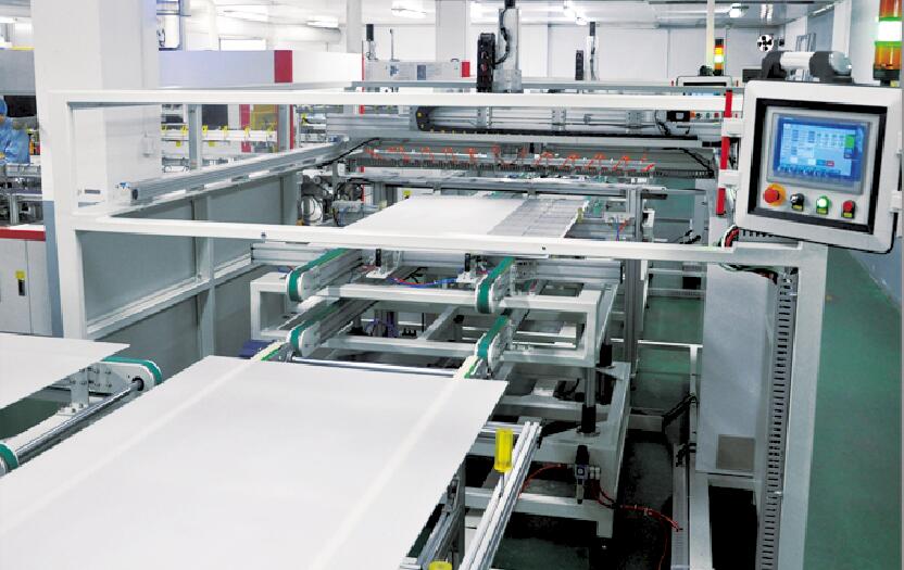 此設(shè)備用于將自動(dòng)串焊機(jī)串焊好的電池串,按照工藝尺寸要求和排版方向順序自動(dòng)排版鋪設(shè)到玻璃/EVA上,組成電池串陣列。玻璃/EVA通過傳輸線傳輸至指定位置,并進(jìn)行機(jī)械定位,四軸機(jī)械手抓取電池串實(shí)現(xiàn)智能相機(jī)檢測(cè)缺陷、定位、自動(dòng)旋轉(zhuǎn)、自動(dòng)排版功能。設(shè)備通過同步帶傳輸與自動(dòng)生產(chǎn)線對(duì)接,實(shí)現(xiàn)了自動(dòng)流水作業(yè)。